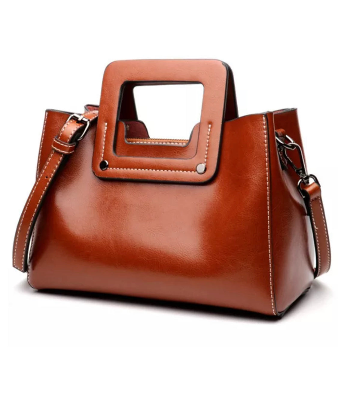 Hannah Leather Purse is crafted with genuine leather, embellished with silver studding, and designed with a zip closure and multiple compartments. An added crossbody strap and handles provide versatile carrying options, while the silver studded feet on the base offer extra protection. This luxury accessory is the perfect blend of style and utility.