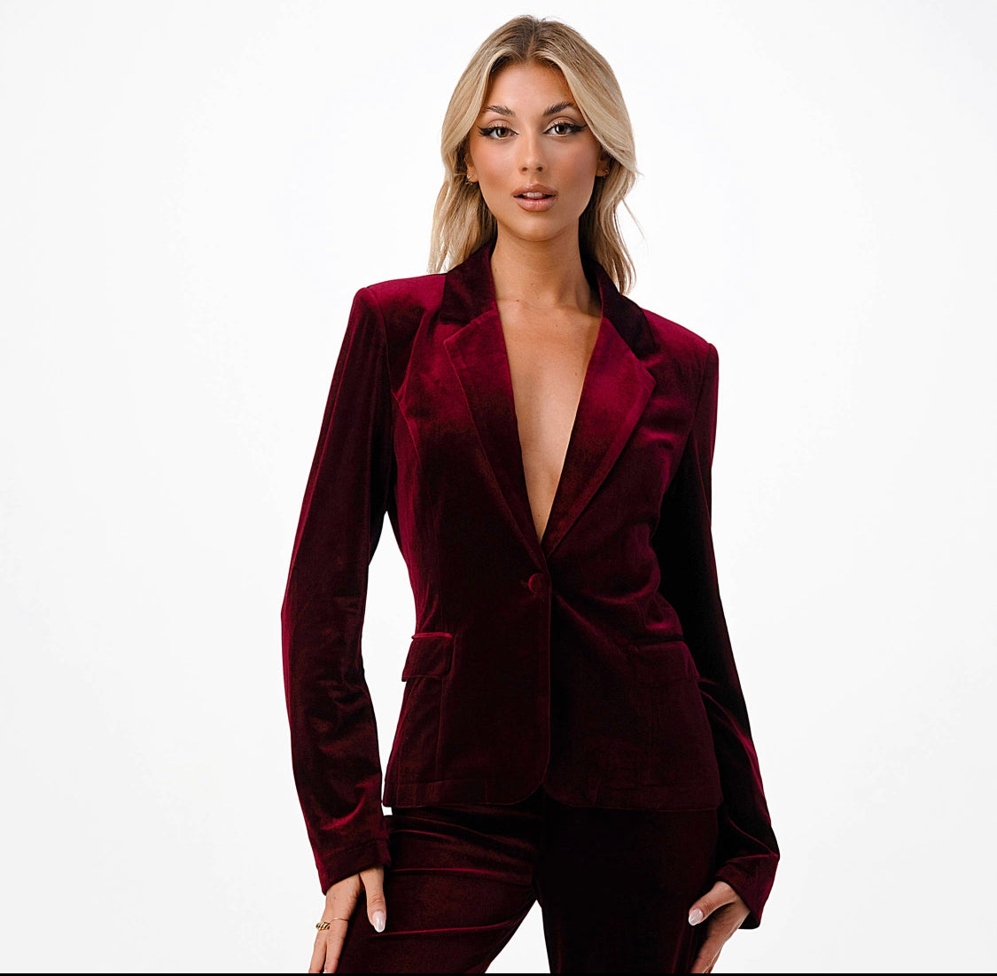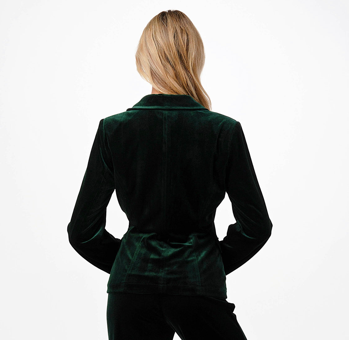 This velvet blazer is cut with darts to create a nipped-in waist framed by structured shoulders and hem vents which emphasize an hourglass silhouette. Fastens with single velvet covered button.